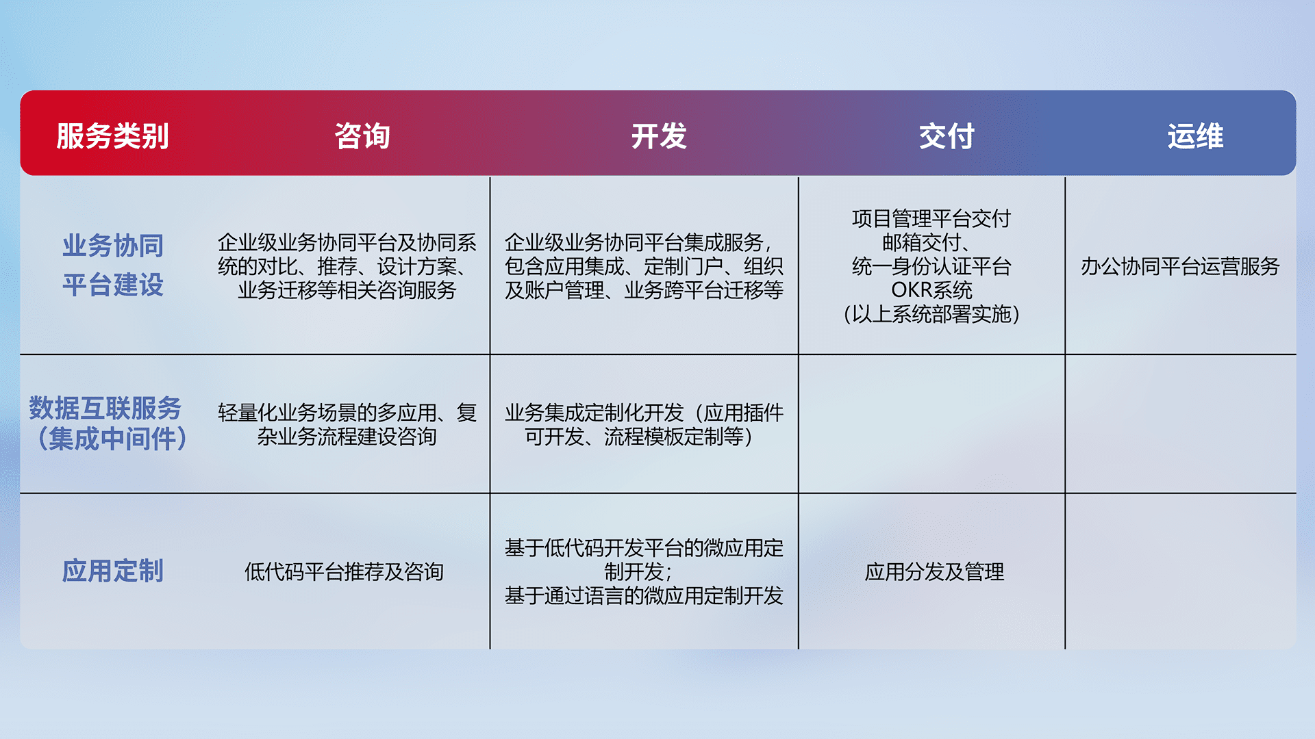 针对钉钉、、、企微、、IDaas等平台级产品提供产品的规划、、、、方案、、交付、、定制化开发等服务,,,实现如统一协同办公、、、智能客户服务、、混合会议管理、、、智能数据查询、、、等业务场景,,实现数字化转型。。。